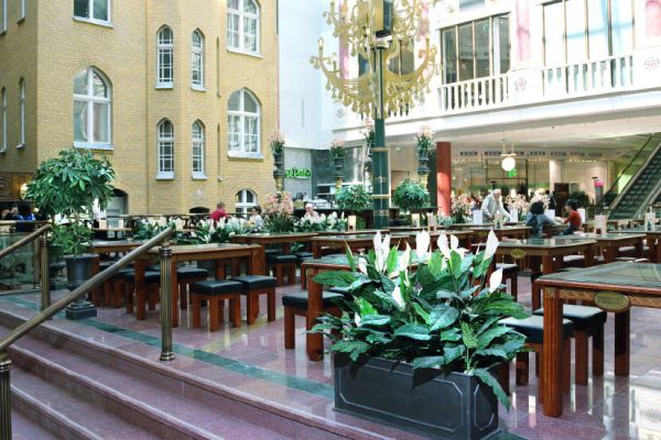 Seit der Eröffnung des Schlosses ist DAUERFLORA für die Bepflanzungen der Berliner Einkaufspassage zuständig. Die Grundidee eines herrschaftlichen Umfeldes zieht sich nicht nur architektonisch und konzeptionell durch das gesamte Einkaufszentrum sondern eben auch bei der Bepflanzung und den Gefäßen, die eigens für die Einkaufspassage entwickelt und gebaut wurden. Alles stützt das Konzept des fürstlichen Shoppens: Bänke, Gefäße mit dem eingeprägten Logo des Schlosses, üppige Pflanzenausstattungen und dekorative Elemente.